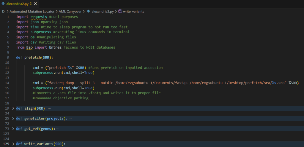 - A main script, “AML”, would collect an SRR number from the user and locate all genetic mutations within the transcriptomic sample,