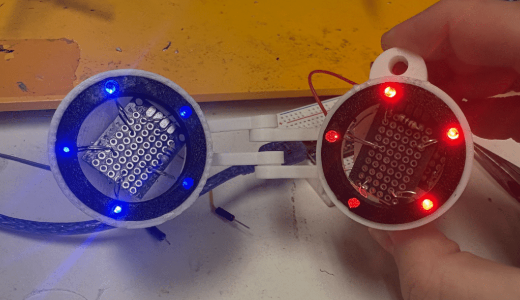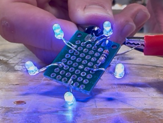 - A basic circuit design was completed. This included two arrays of 5 LEDs, a momentary switch to control the circuit, and 2 3V CR2032 batteries.