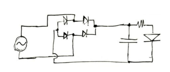 An early version of the plate’s electric circuit. This version assumed an AC source to account for rack backspin, and as such, a rectifier was include in the circuit.